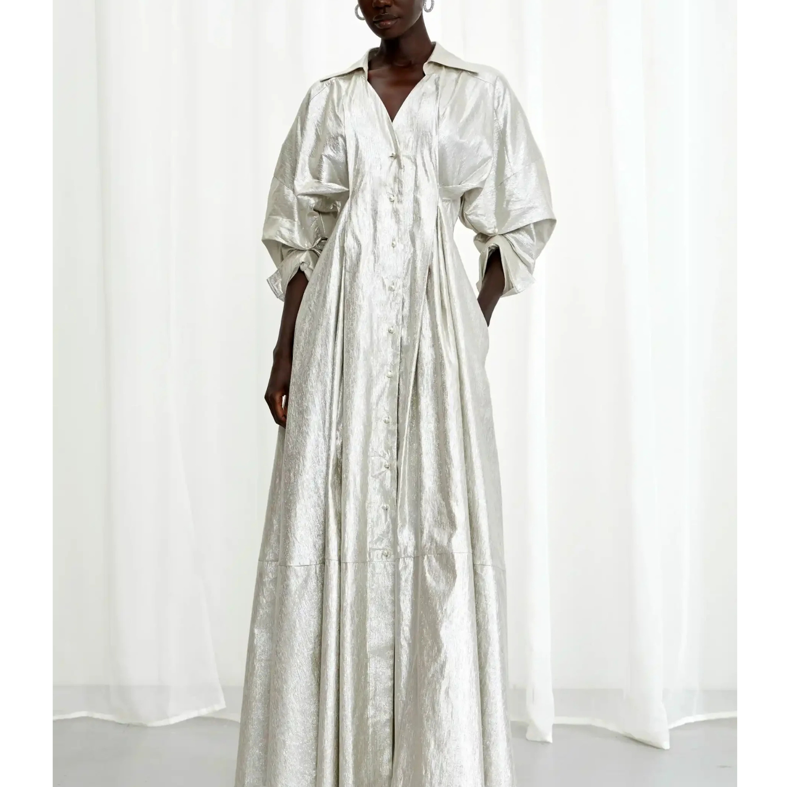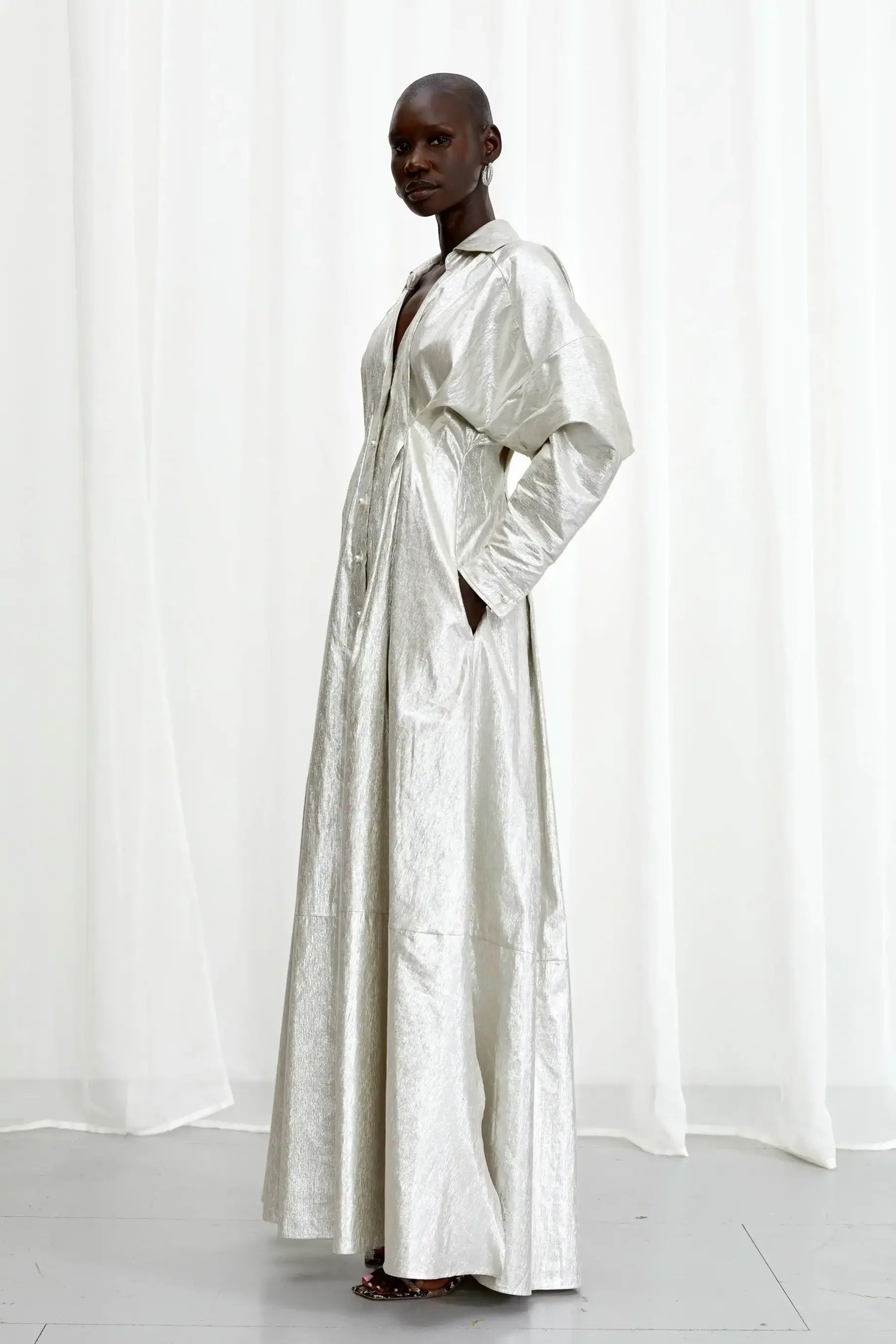 Floor-length with side pockets this dress also has a collared V-neckline that creates a perfect mantle to display jewellery.