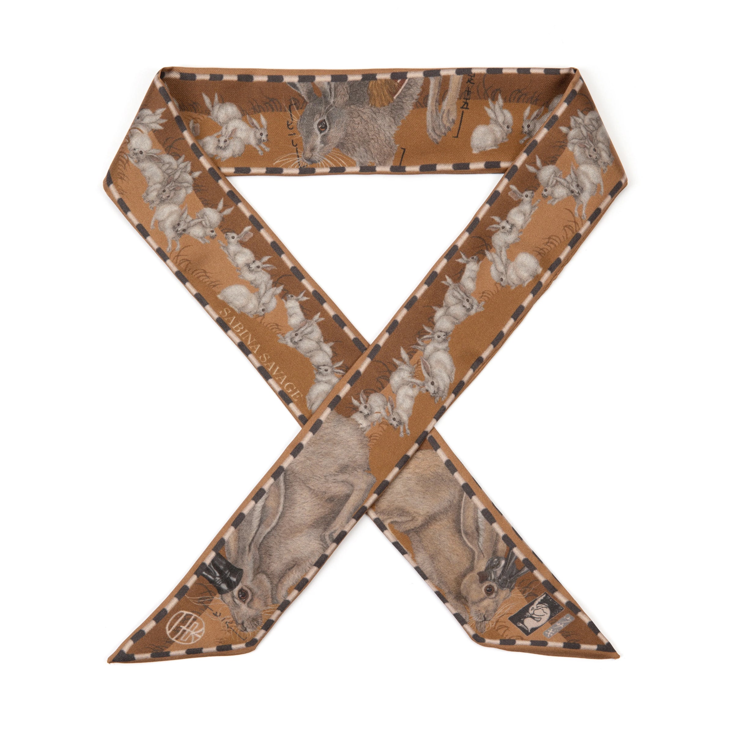 This design references many elements of the arts and culture of Edo-period Japan. It features a pair of black tailed jackrabbits at either end, with a third floating in the centre of the scarf. Behind is a layered, grassy hillside teeming with white rabbits. Throughout the design, details and measurements are noted in Japanese hand-script, echoing ancient zoological manuscripts from the 17th century, and a stamp/seal bearing a silhouetted rabbit and the name Sabina Savage brands one end of the ribbon.