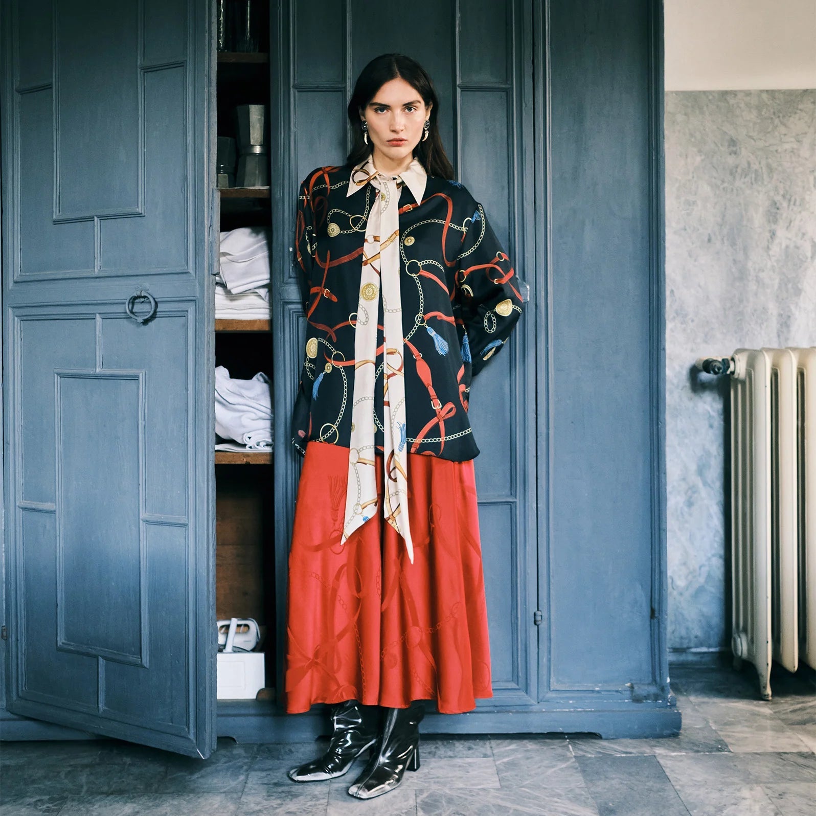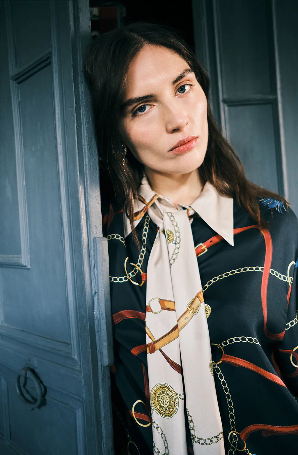 An over-sized, soft, and enveloping blouse with a keyhole neckline and silk jacquard-covered buttons, showcasing attention to detail. The cuffs add character, while a removable scarf can be tied as desired, creating a striking contrast.