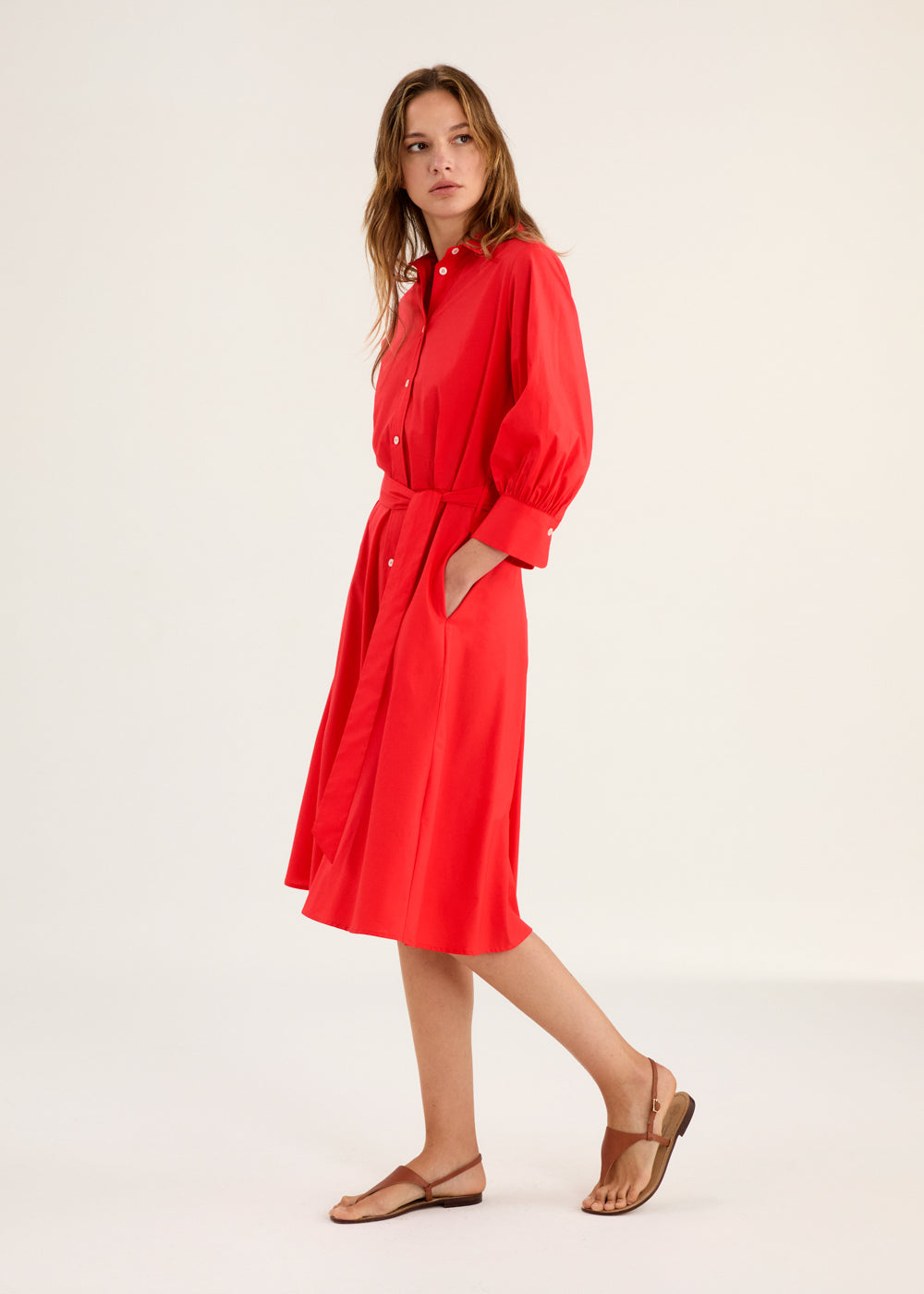 Belted Shirt Dress with Puffed Sleeves - Red
