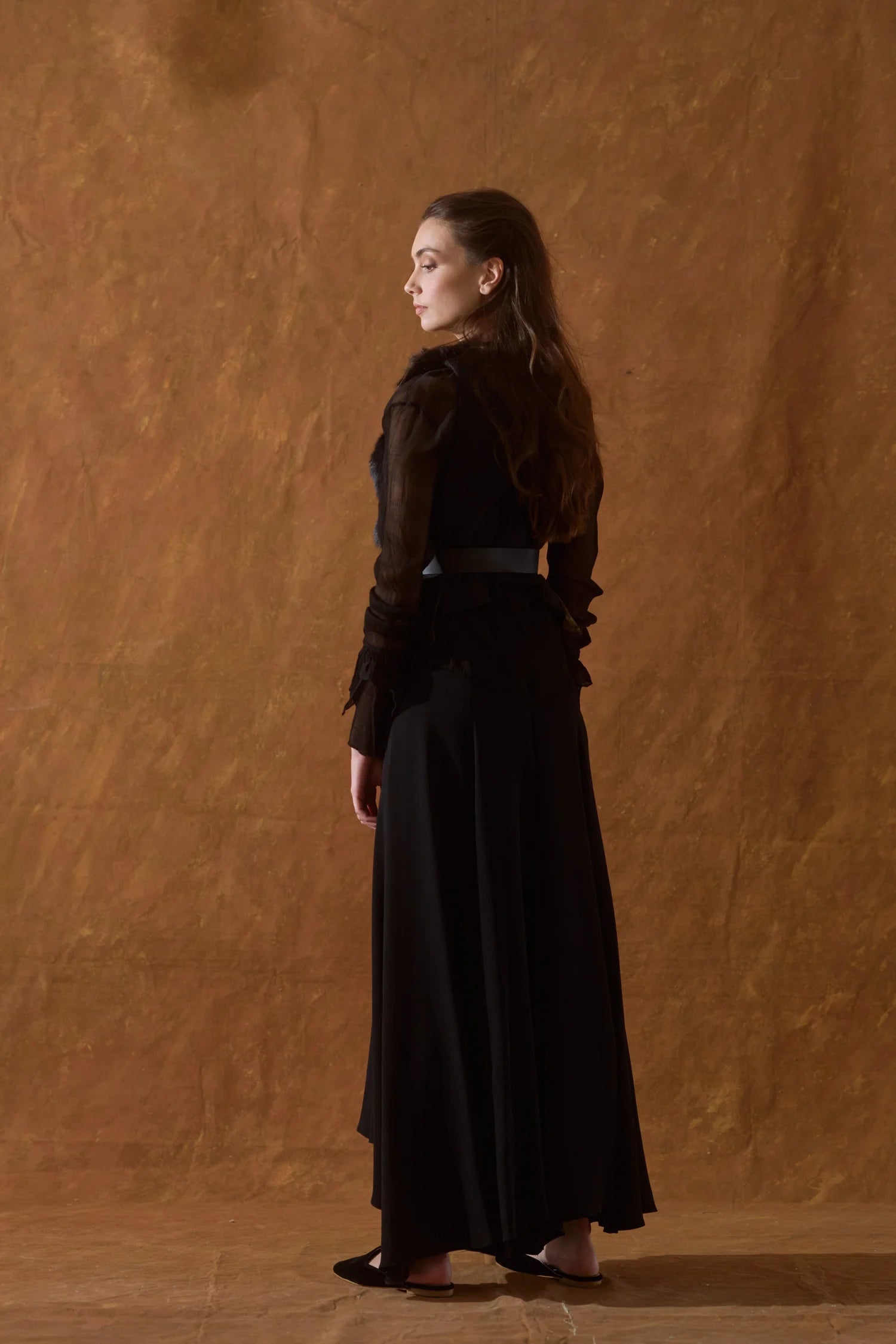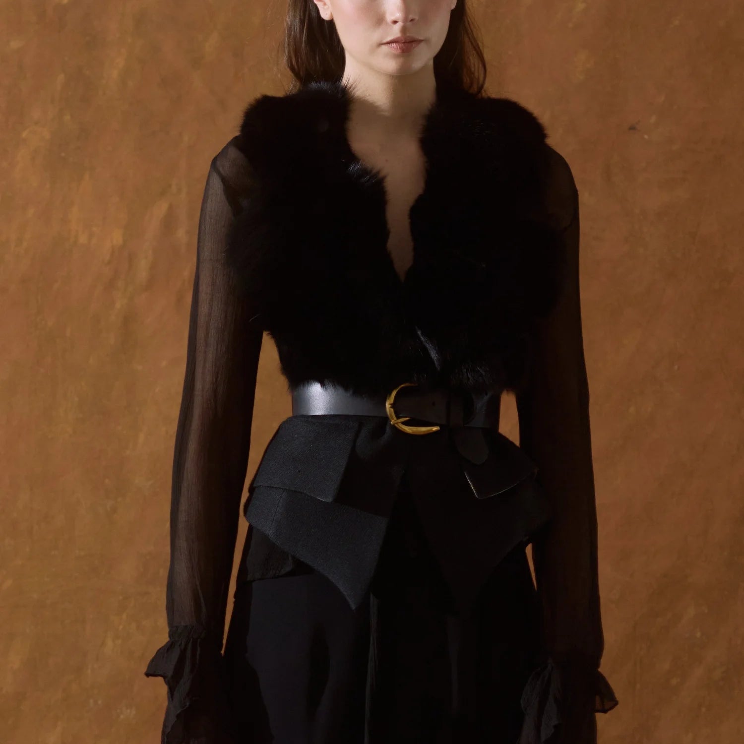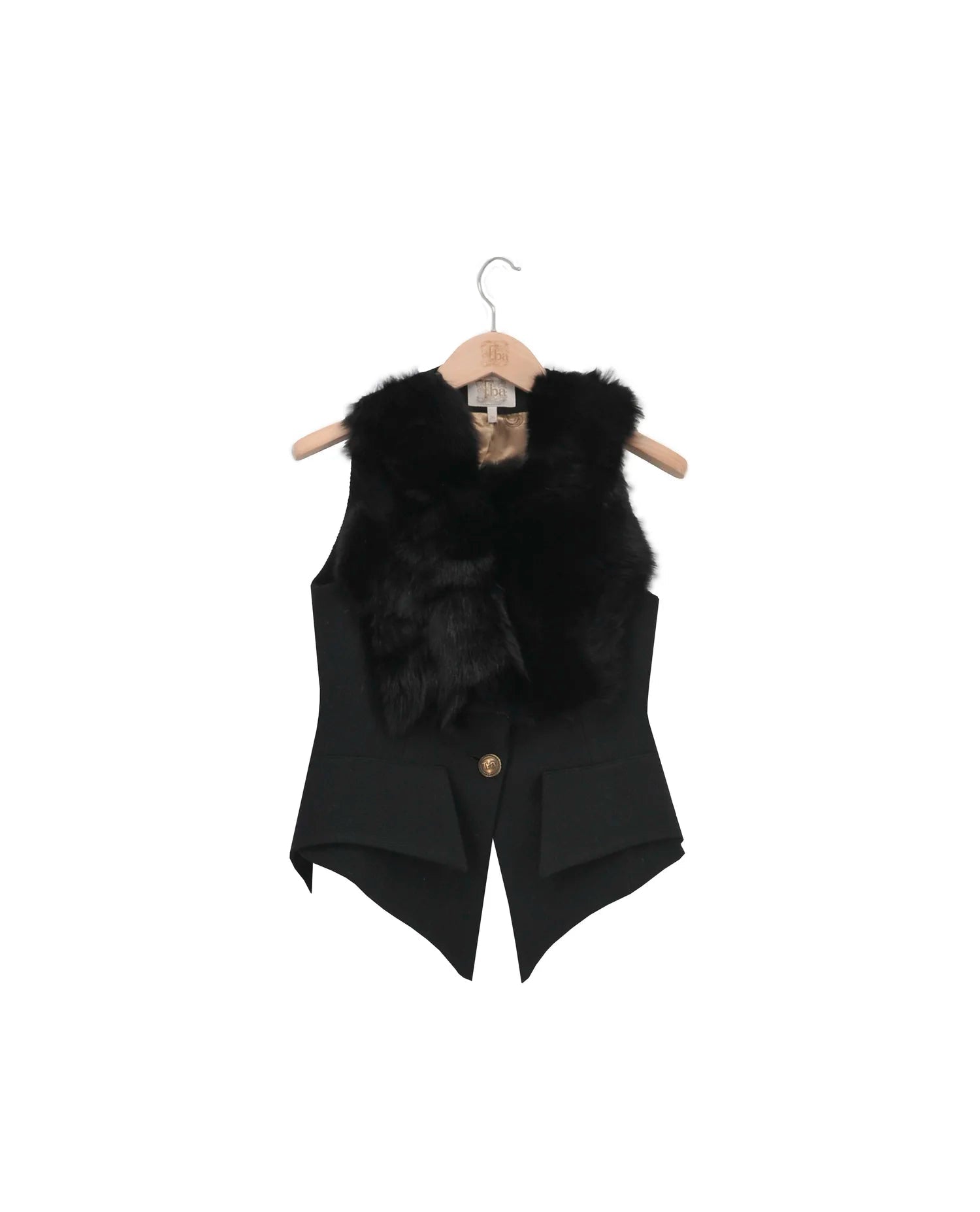 This black wool vest features a soft Finn raccoon fur collar and a smooth silk lining, combining warmth with refined style. Its short tweed design offers a timeless, elegant look perfect for elevating any outfit with understated sophistication.